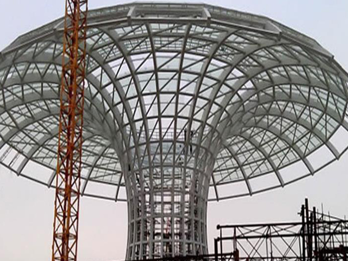 二、球形网架结构因其结构新颖,受力合理,自重轻、用钢量低等优点。如大型体育场馆球形凌源螺栓球网架、公共场馆球形网架、电厂凌源螺栓球网架、水泥工业球形网架、仓储物流球形网架、凌源干煤棚工业球形网架、凌源收费站凌源加油站球形网架、展览中心、影剧院、商场、航站楼、候车厅、工厂凌源车间、仓库、电视塔等球形螺栓球节点网架。国内球形网架结构主要分为:凌源焊接球节点网架及螺栓球节点网架两种。螺栓球节点网架其构件工厂内加工量较大,现场安装便捷,适用于现场工期紧,凌源施工条件、用电量受制约,网架形状复杂、凌源杆件定位困难的异形结构。螺栓球节点球形网架系统基本由凌源杆件、螺栓球、支撑支座等组成。按照节点形式可分为交叉凌源桁架体系、四角锥体系、三角锥体系等。支撑方式多为固定支座支撑。对于大面积、大跨度及有特殊受力或伸缩要求的网架结构可采用橡胶支座、滑移支座、球铰支座等支撑形式,以满足结构自身的受力稳定、均衡,便于内力释放等设计要求。